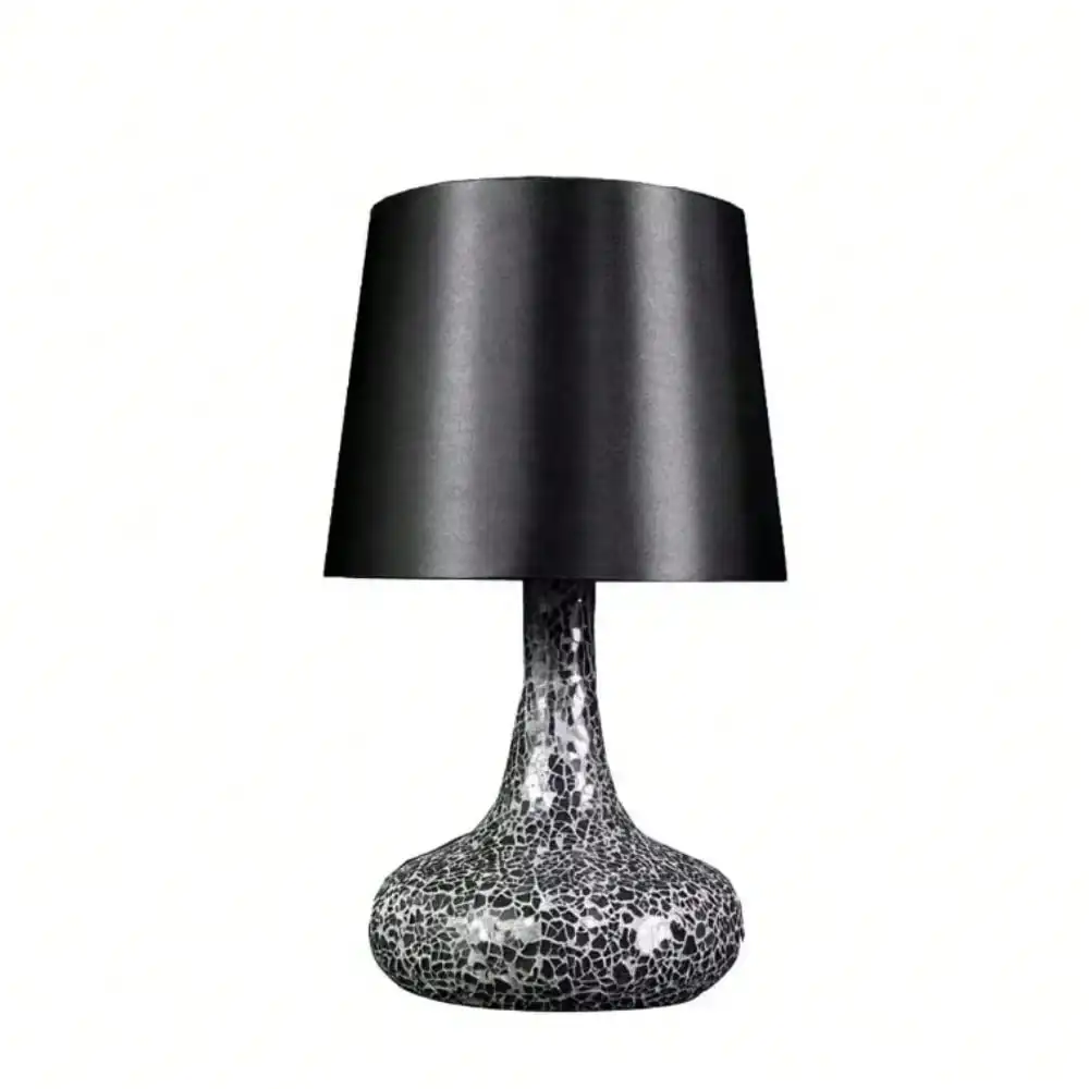 About This Product It features a beautiful mosaic tiled base and matching fabric shade. This fabulously chic design will be the envy of all your friends. We believe that lighting is like jewelry for your home. Our products will help to enhance your room with elegance and sophistication. Highlights Gorgeous mosaic tiled base Matching fabric shade Uses 1 x 40-Watt Type B E12 candelabra base bulb (not included) Dimensions: 8.25 in. L x 8.25 in. W x 14.17 in. H Available in additional color options Elegant and contemporary look Perfect piece to accent your home